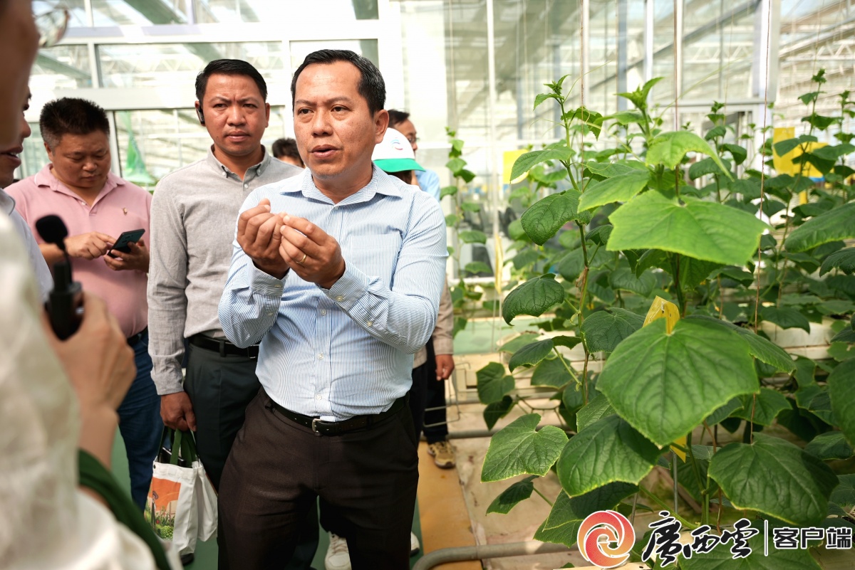 2025年9月,广西援老挝技术合作减贫示范项目老挝代表团考察南宁市青秀区刘圩镇晟发现代设施蔬菜基地,老挝农业与环境部农村发展与减贫司阿诺萨·鹏提玛翁副司长询问大棚基质栽培黄瓜技术。自治区农业农村厅 供图
