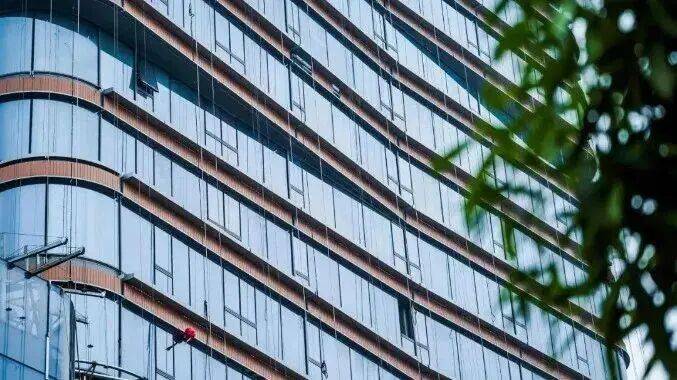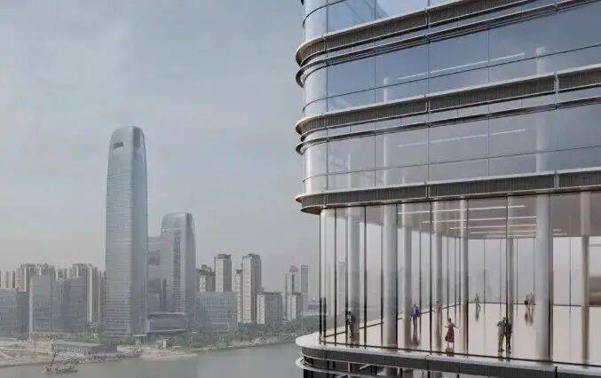 外立面采用木色陶板与全景玻璃幕墙,以“曲水流觞”的涟漪造型呼应珠江文脉,同时融入垂直生态理念,打造空中绿岛与可呼吸的建筑肌理。